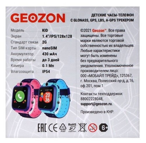 | Дополнительная информация | мобильное приложение "GEOZON CARE", запрос фото с устройства, аудиомониторинг, определение местоположения, кнопка SOS, установка геозон |