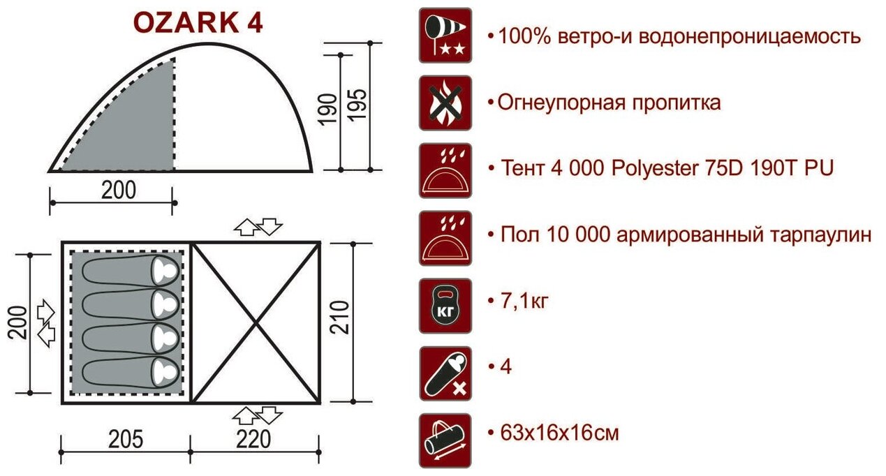 | Водостойкость тента/дна | 4000 / 10000 мм в.ст. |
