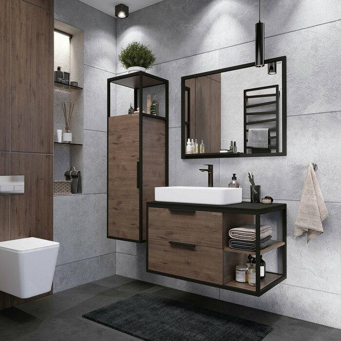 Тумба под раковину подвесная с 2 ящиками Grossman ЛОФТ-90 см веллингтон/металл черный.