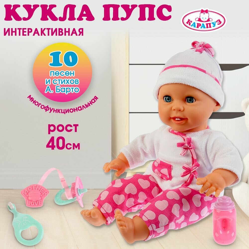 Купить Пупс Карапуз 40 см Мягкое тело 10 песен А.Барто 5 функций Первый зуб Чистит зубки 16351-RU