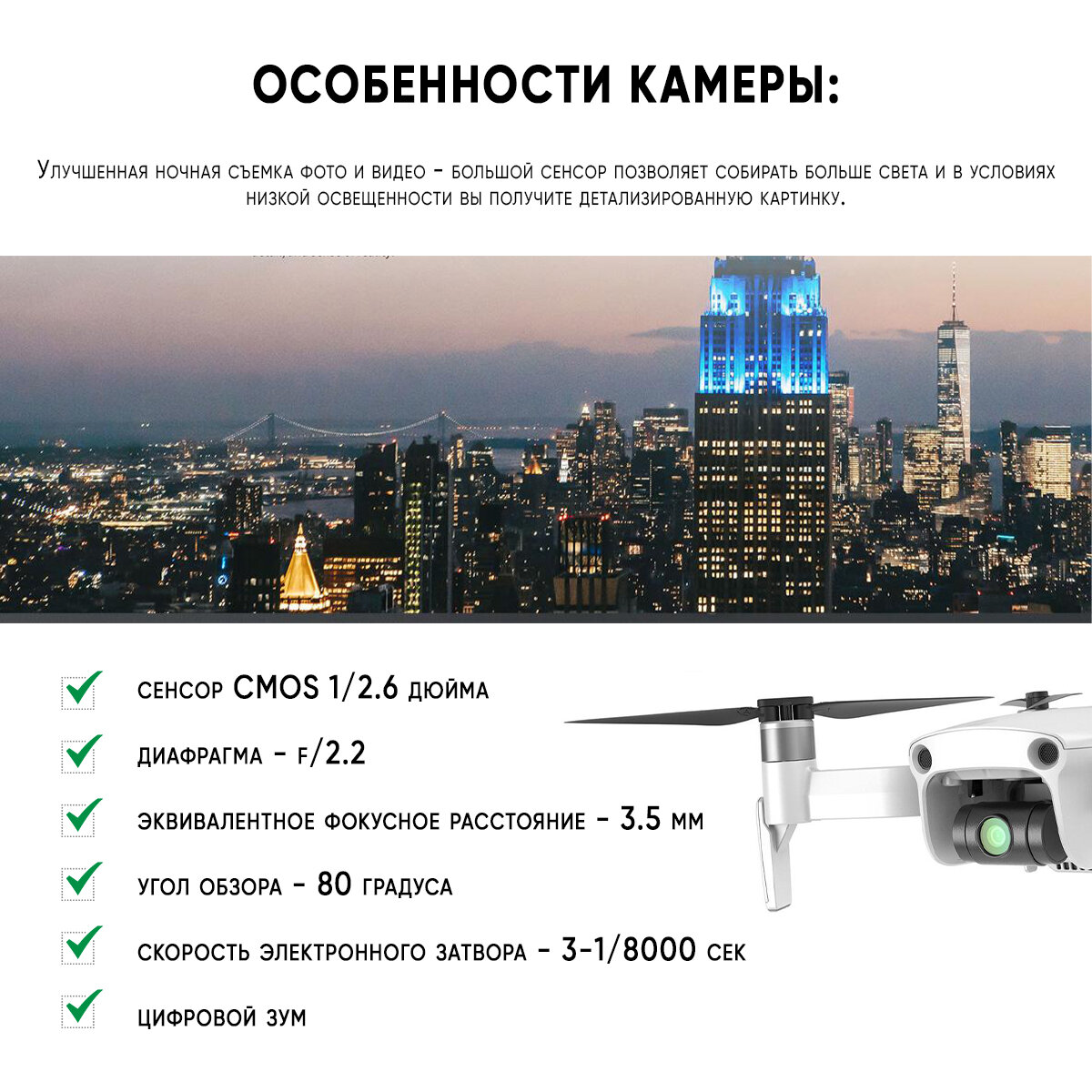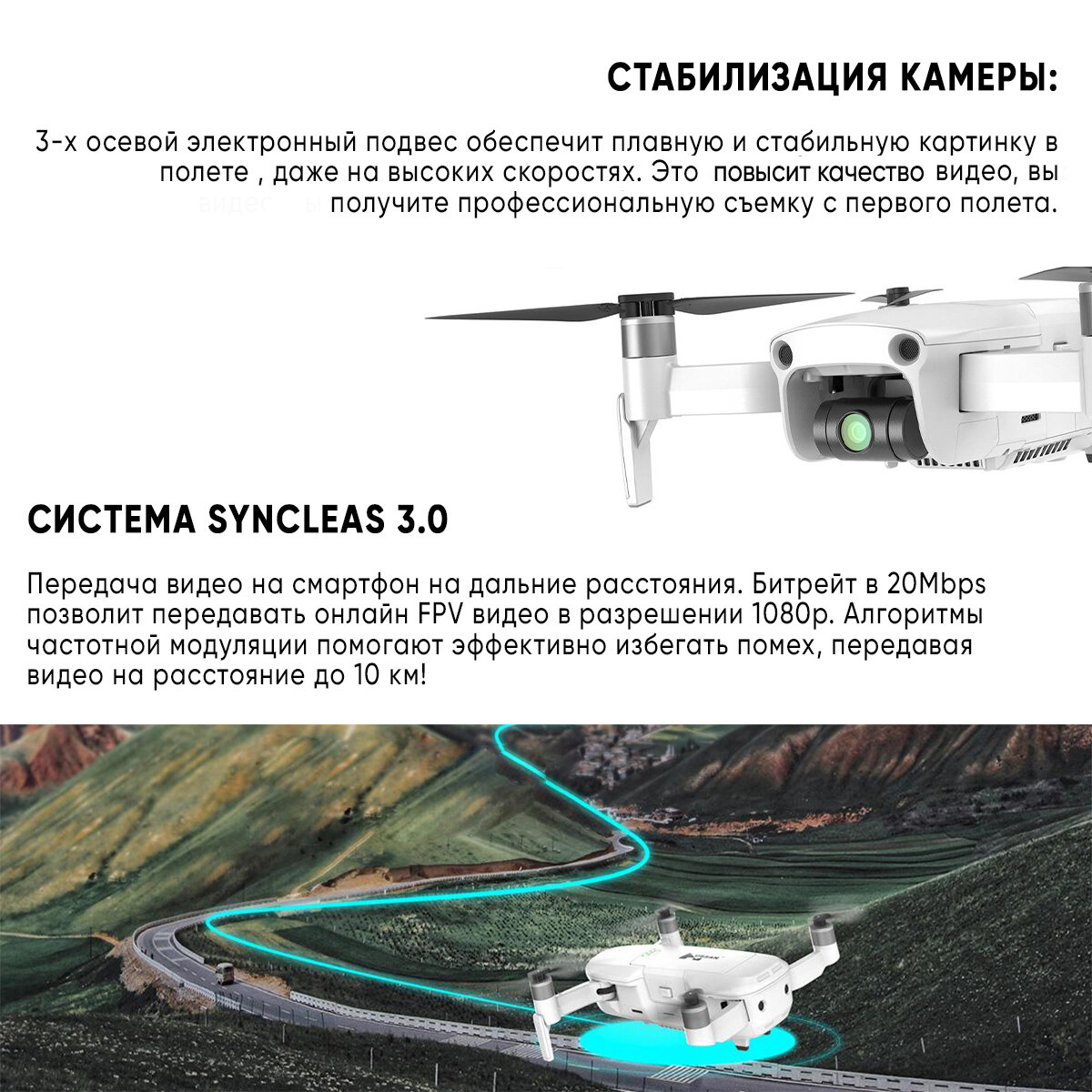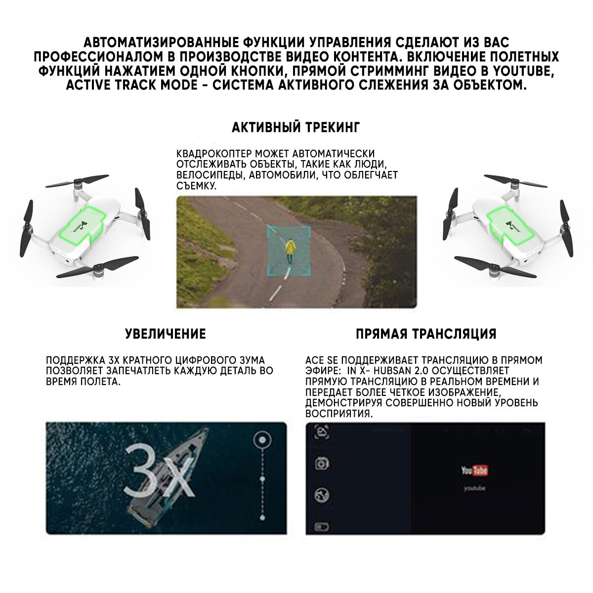 | Функции | headless mode / автоматический взлет и посадка / вид от первого лица (FPV) / возвращение в точку взлета / следование за оператором |