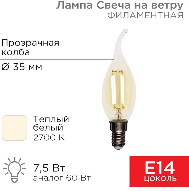 Филаментная лампа REXANT Свеча на ветру CN37 7.5 Вт 2700K E14 604-101 интересное: