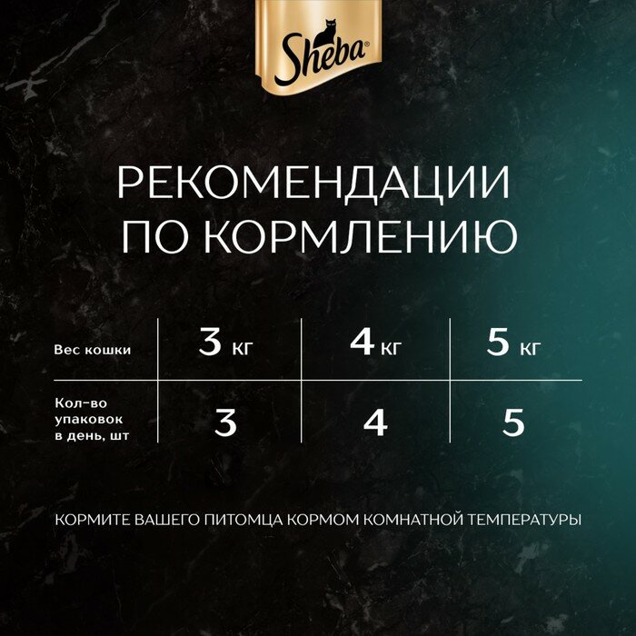 | Дозировка | - вес кошки 3 кг – 3 упаковки корма в сутки - вес кошки 4 кг – 4 упаковки корма в сутки - вес кошки 5 кг – 5 упаковок корма в сутки |
