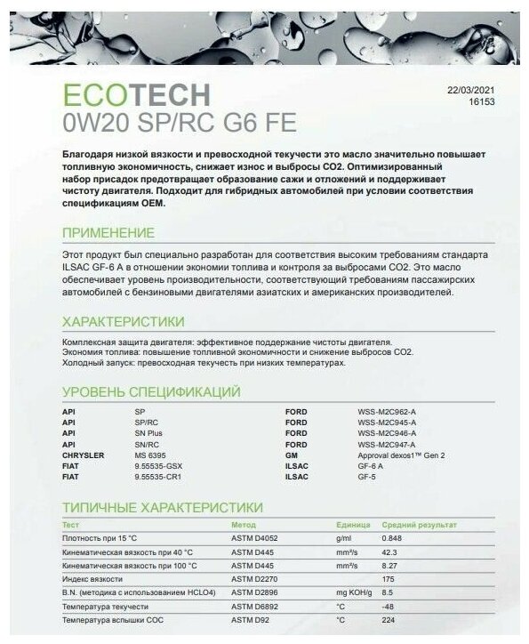 | Допуски OEM | Chrysler MS 6395 / FIAT 9.55535-CR1 / FIAT 9.55535-GSX / Ford WSS-M2C 945-A / Ford WSS-M2C 946-A / Ford WSS-M2C 947-A / Ford WSS-M2C 962-A1 / GM Dexos 1 Gen 2 |