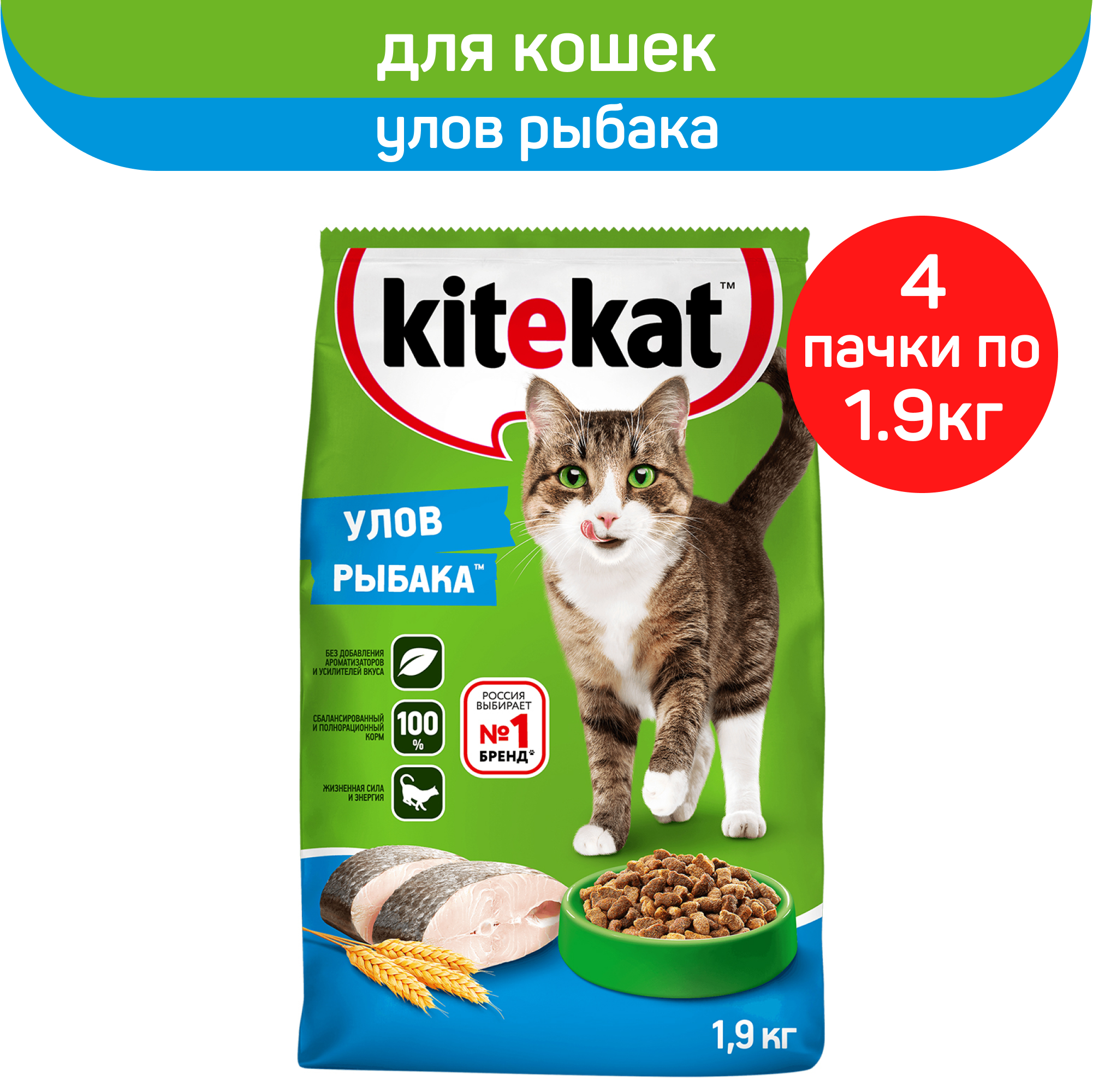 Купить Сухой полнорационный корм KITEKAT для взрослых кошек Улов Рыбака, 4шт х 1.9кг
