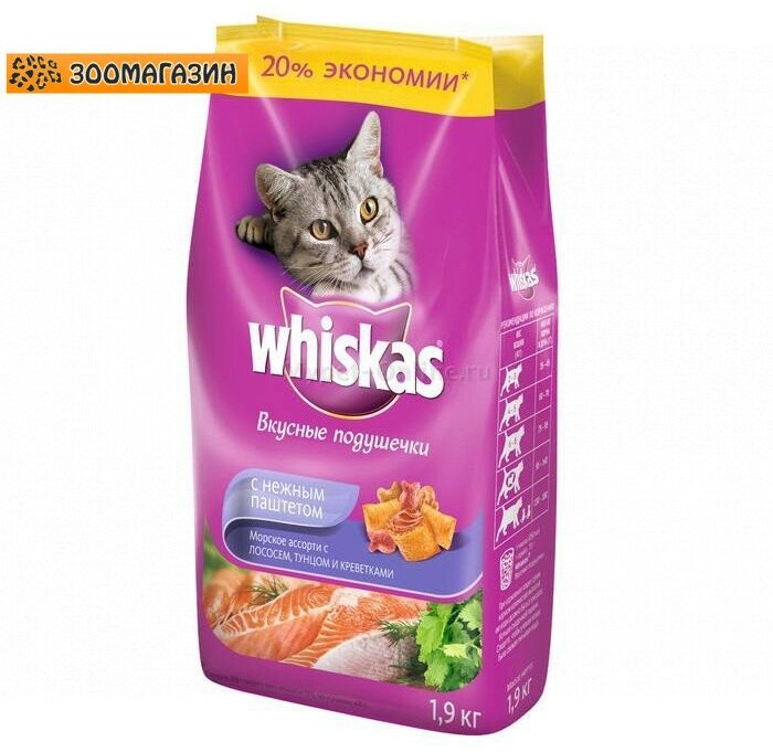 Whiskas Сухой корм для кошек Вкусные подушечки с нежным паштетом Аппетитный обед с лососем1015020810218341 1,9 кг 24247