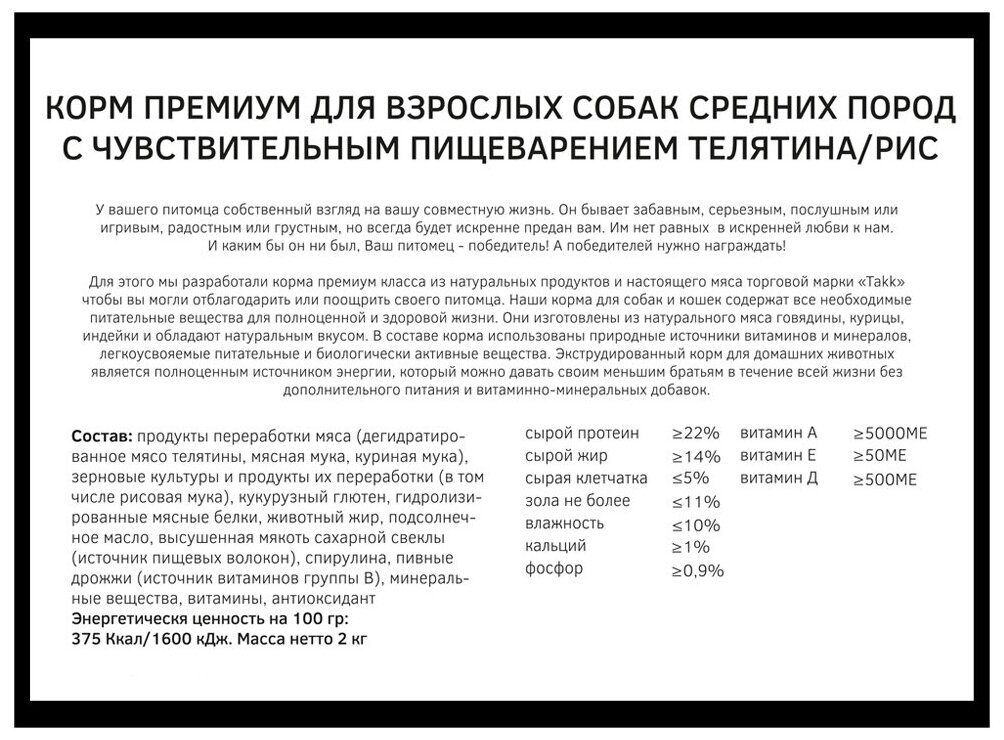 Ниже Вы можете прочитать отзывы на Сухой корм Takk для взрослых собак средних пород с чувствительным пищеварением с телятиной и рисом 2кг, ознакомится с подробными характеристиками, посмотреть интересные обзоры и фотографии на Сухой корм Takk для взрослых собак средних пород с чувствительным пищеварением с телятиной и рисом 2кг.