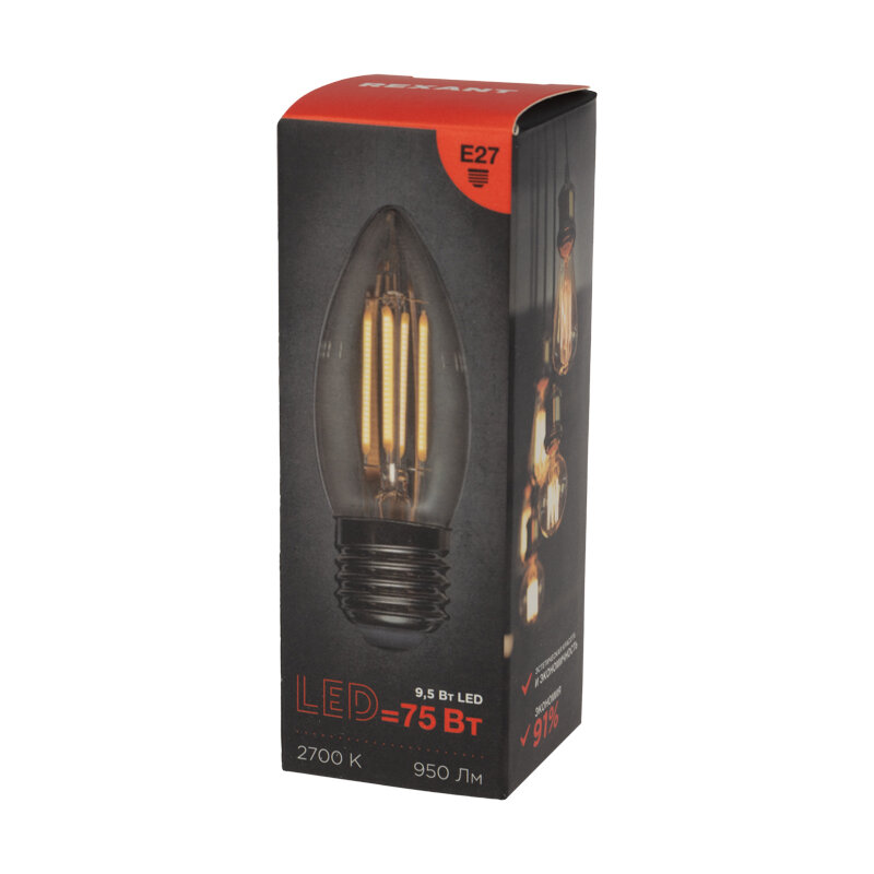 Лампа филаментная Rexant Свеча CN35, 9.5 Вт, 950 Лм, 2700K, E27 в прозрачной колбе интересное: