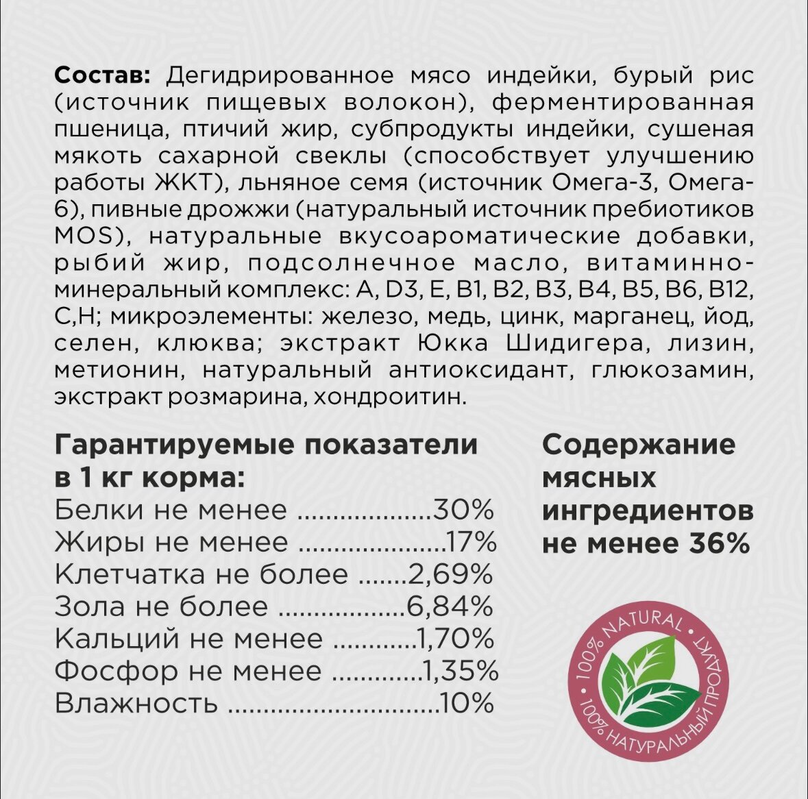 | Состав | дегидрированное мясо индейки, бурый рис (источник пищевых волокон), ферментированная пшеница, птичий жир, субпродукты индейки, сушеная мякоть сахарной свеклы (способствует улучшению работы ЖКТ), льняное семя (источник Омега-3, Омега-6), пивные дрожжи (натуральный источник пребиотиков MOS), натуральные вкусоароматические добавки, рыбий жир, подсолнечное масло, витаминно- минеральный комплекс, микроэлементы, клюква; экстракт Юкка Шидигера, лизин, метионин, натуральный антиоксидант, глюкозамин, экстракт розмарина, хондроитин |