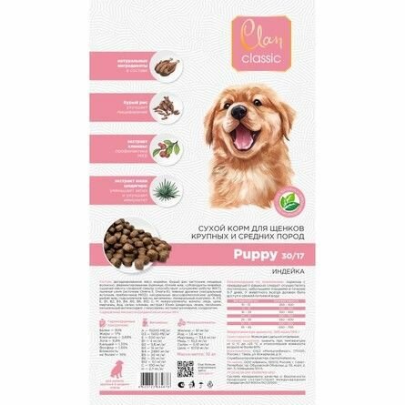 Корм для щенков крупных и средних сухой CLAN Classic Puppy 30/17, индейка, 1.25кг