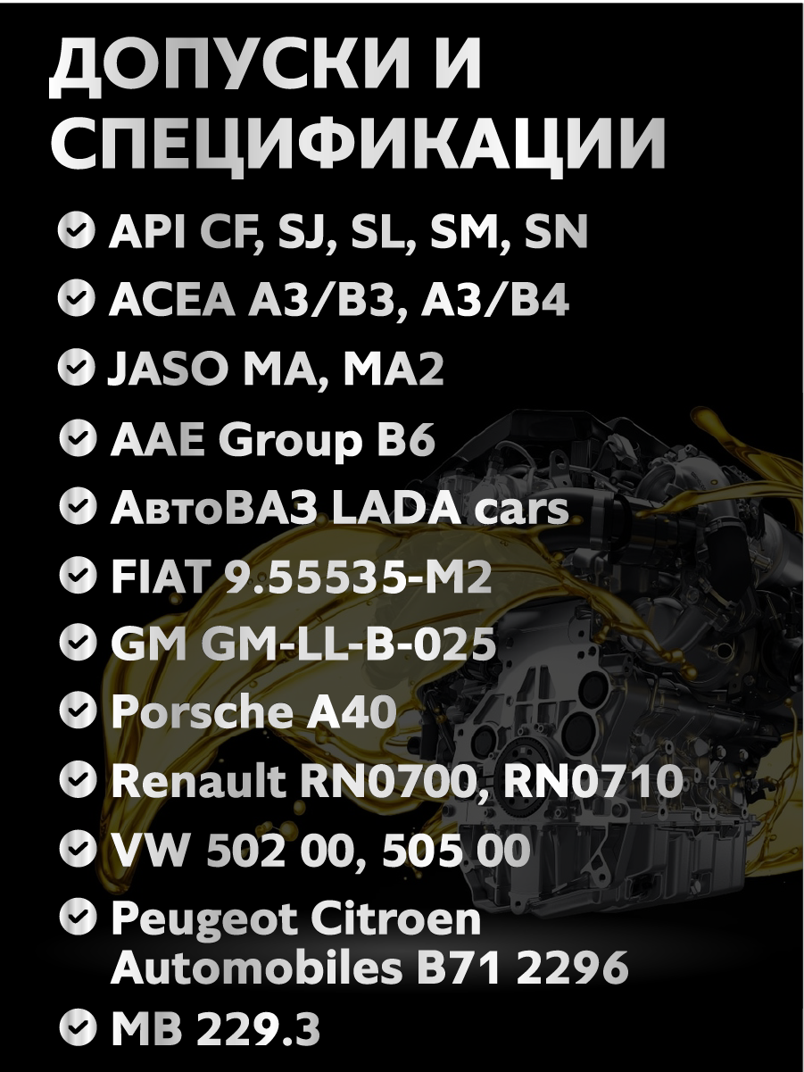 | Допуски OEM | MB 229.3 / PORSCHE A40 / Renault RN 0700 / Renault RN 0710 |