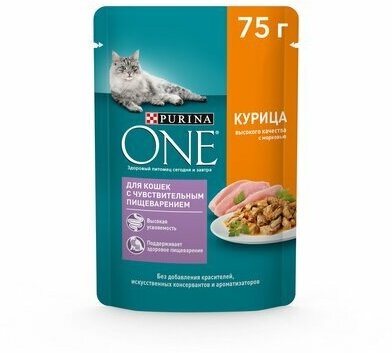 Корм для кошек PURINA ONE с чувствительным пищеварением, курица с морковью пауч 75г (упаковка - 26 шт)