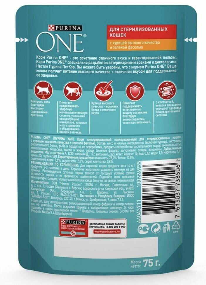 Влажный корм Purina one для стерилизованных кошек, с курицей и зеленой фасолью, 75г х 10 шт интересное: