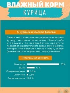| Состав | мясо и мясные ингредиенты (включая курицу), экстракты растительного белка, рыба и продукты ее переработки, продукты переработки растительного сырья, аминокислоты, минеральные вещества, масла и жиры, овощи (зеленая фасоль), загустители, сахара, витамины |