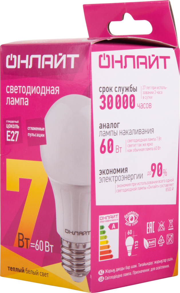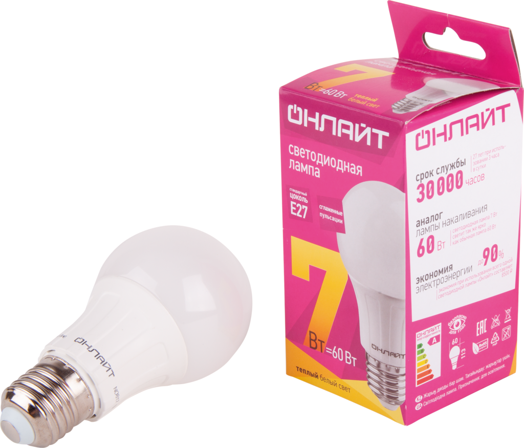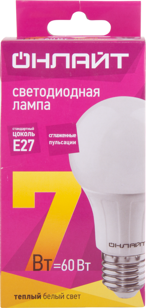 Лампа светодиодная E27, 7 Вт, 60 Вт, груша, 3000 К, свет теплый белый, Онлайт