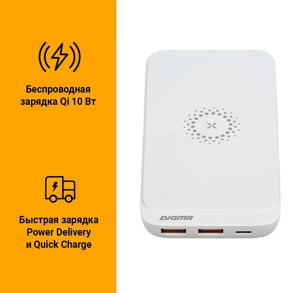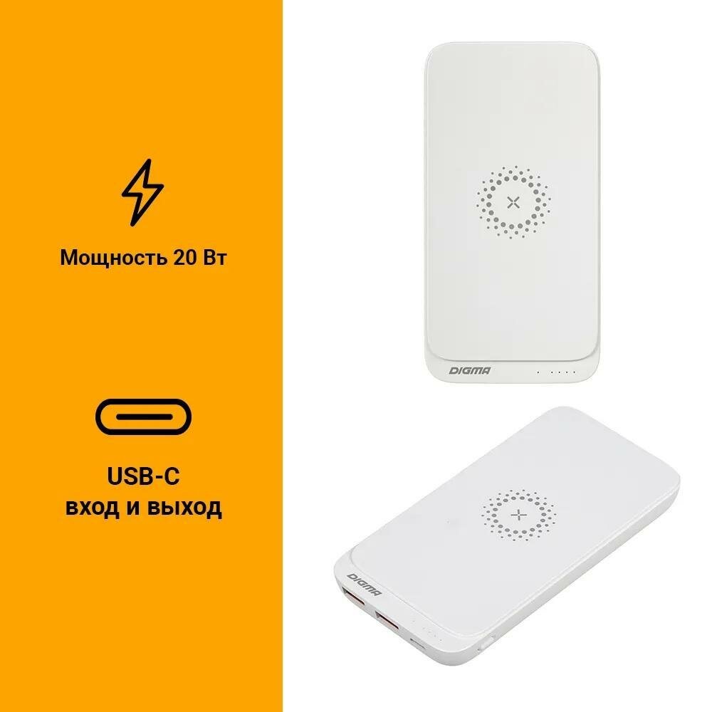Мобильный аккумулятор Digma DGPQ10E 10000mAh 3A QC PD 20W 2xUSB беспроводная зарядка белый (DGPQ10E20PWT)