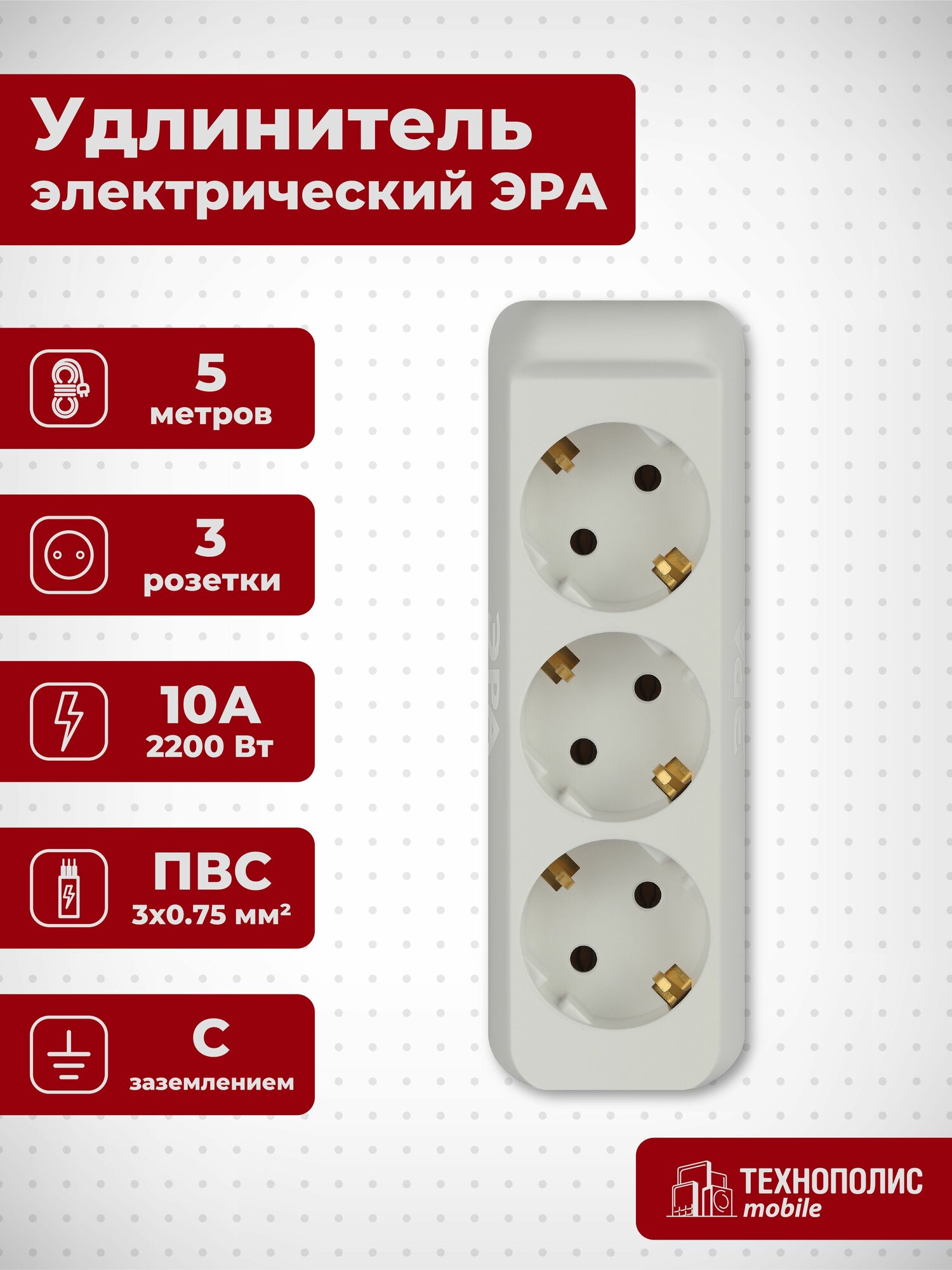 Удлинитель 3гнезда 5м с заземлением ПВС 2200Вт 3x0.75мм² Эра (20) интересное: