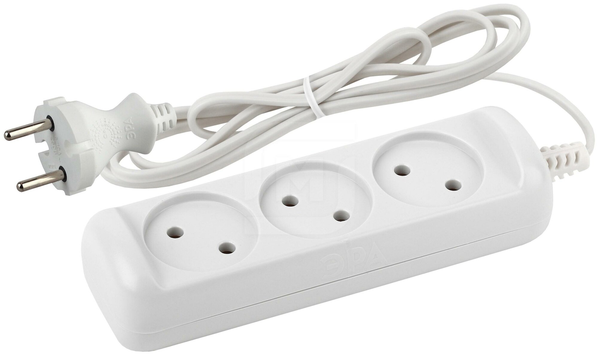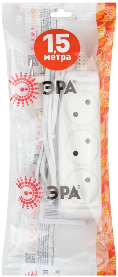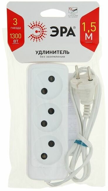 Удлинитель электрический ЭРА, 3 гнезда, без заземления, 1,5 м, белый