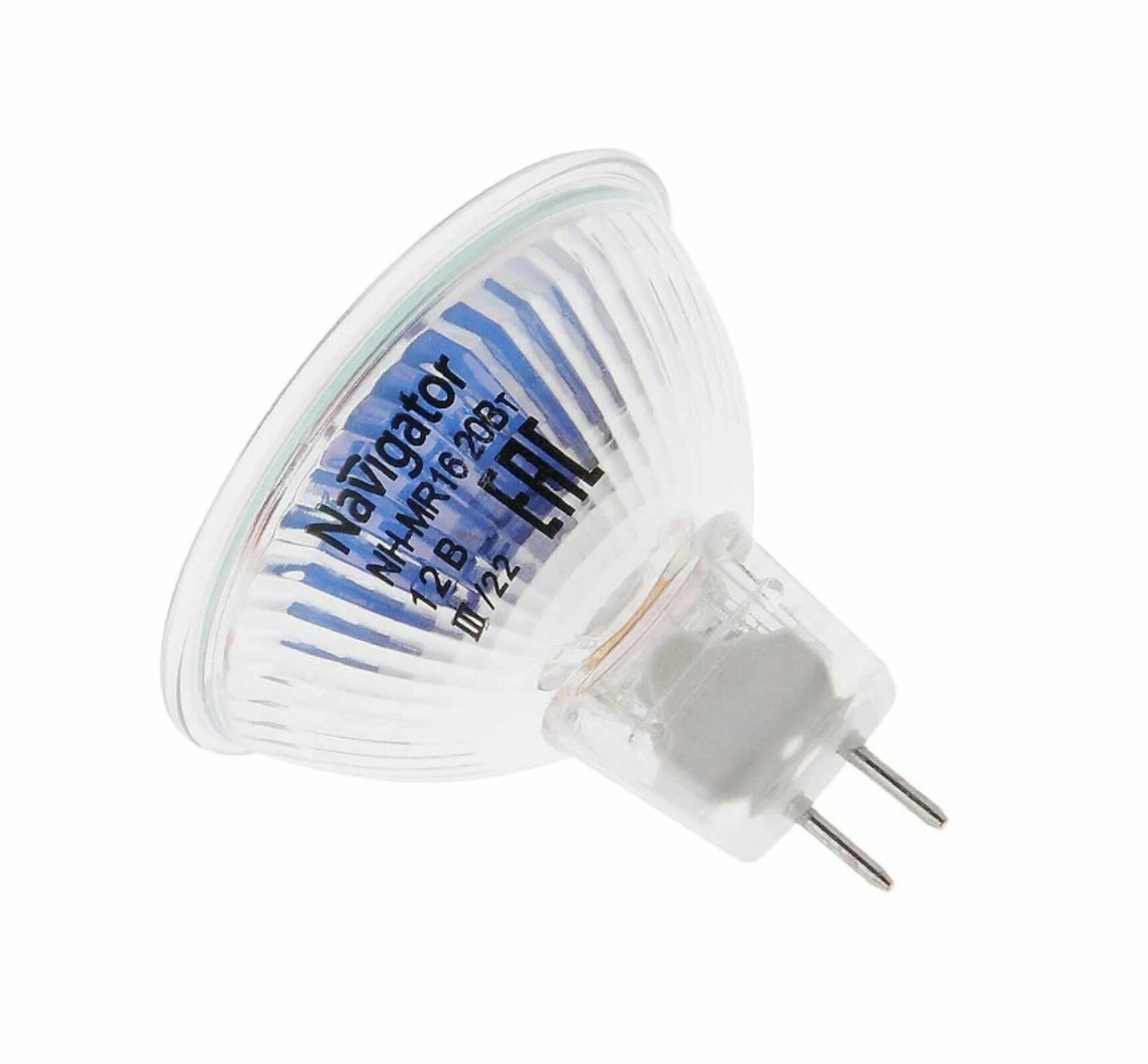 (20 шт.) Низковольтная галогенная лампочка Navigator MR16, мощность 20 Вт, напряжение питания 12 В, цветовая температура 3000 К, теплый белый свет, цоколь GU5.3, диммируемая, размер 51х50 мм
