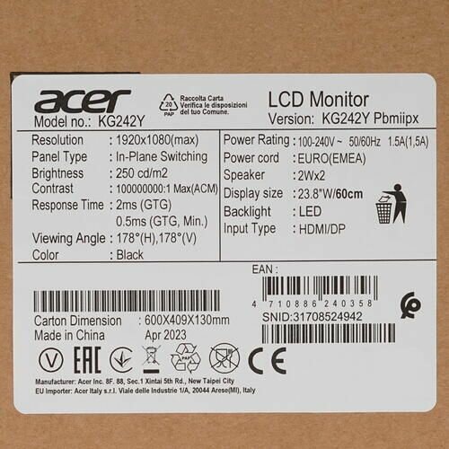 Монитор 23.8" Acer KG242YPBMIIPX IPS 1920x1080 (UM. QX2EE. P05)