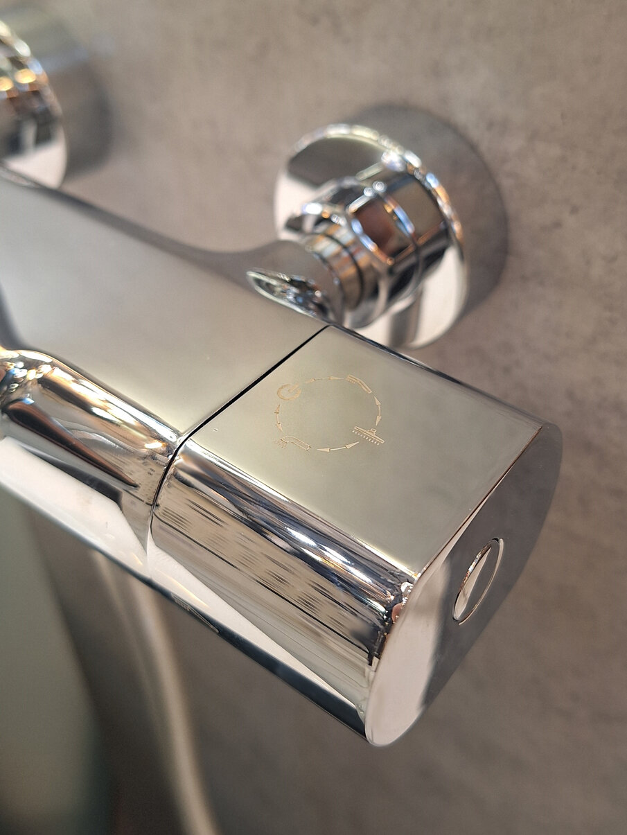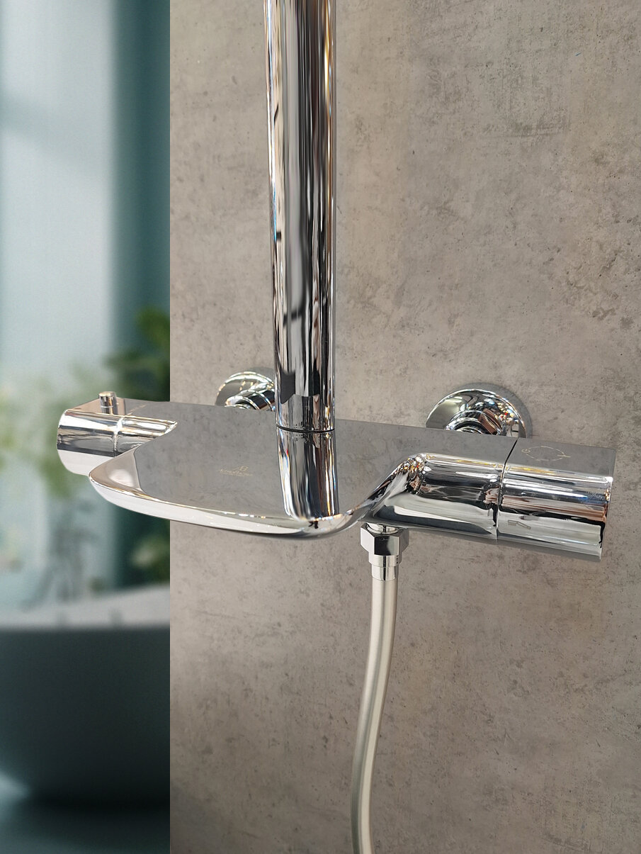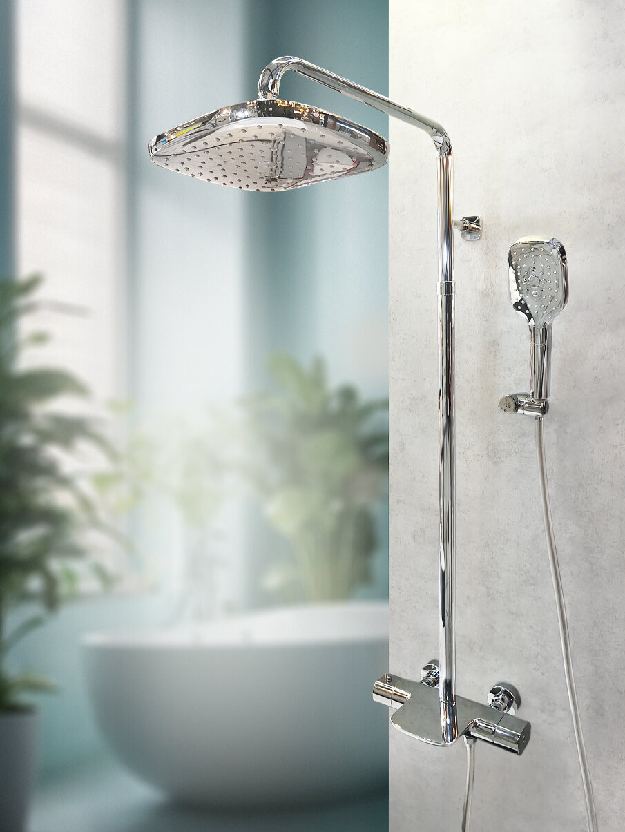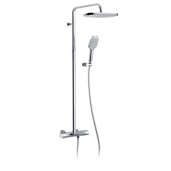 | Комплектация | термостатический смеситель настенного монтажа / телескопическая штанга / ручной душ / гибкий полимерный шланг / регулируемый по высоте верхний душ / эксцентрики / чаша декоративные / настенный держатель ручного душа |
