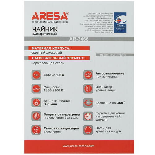 Чайник Aresa AR-3466 1850-2150Вт, 1л. сталь, Strix интересное: