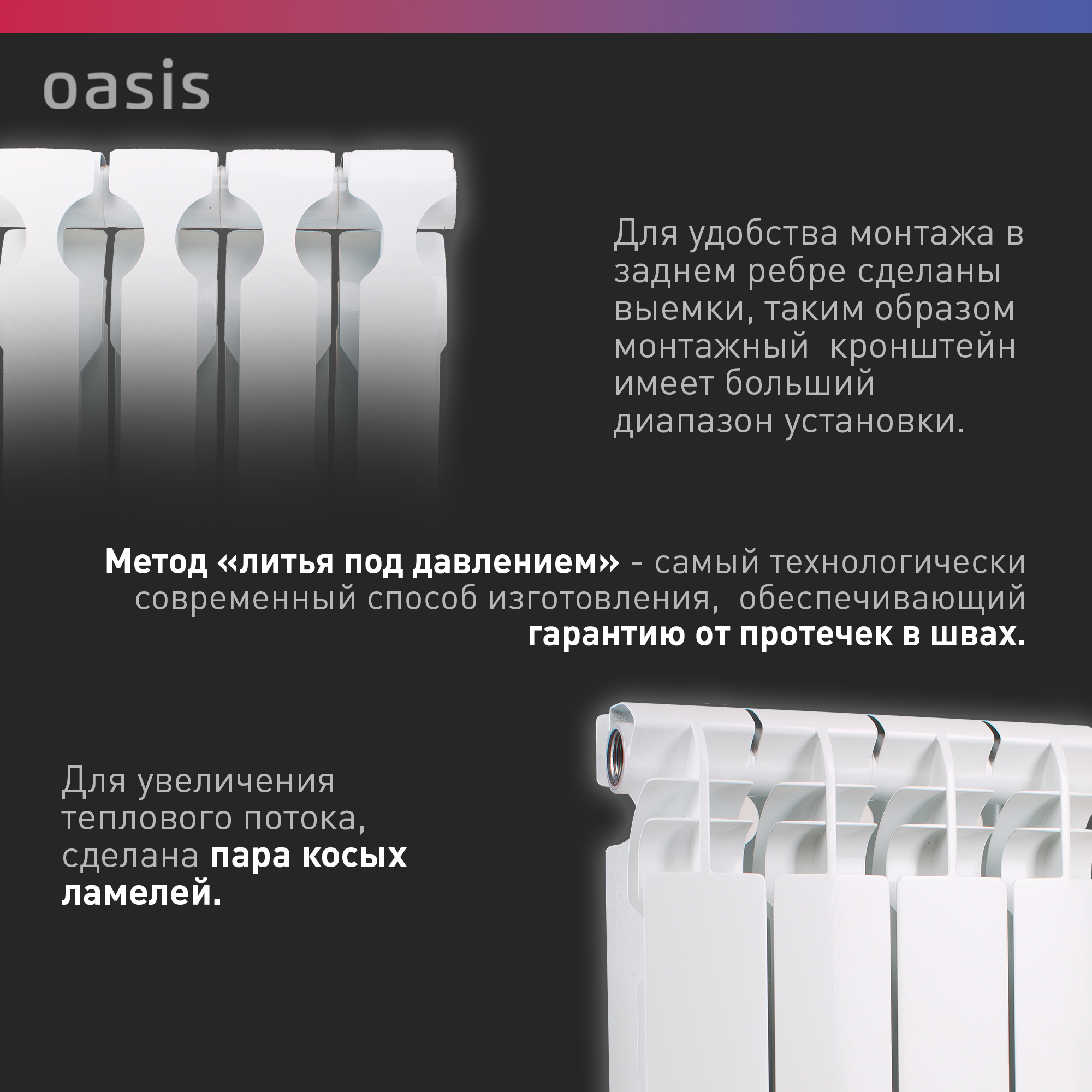 СохранитьРадиатор алюминиевый литой OASIS PRO 4 секций, 500/96/4 (Россия) интересное:
