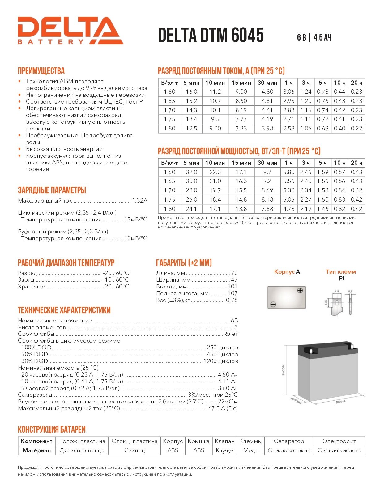 Аккумуляторная батарея DELTA для источника бесперебойного питания, 6/4,5 В/Ач, 70x47x107 мм (DTM 6045)