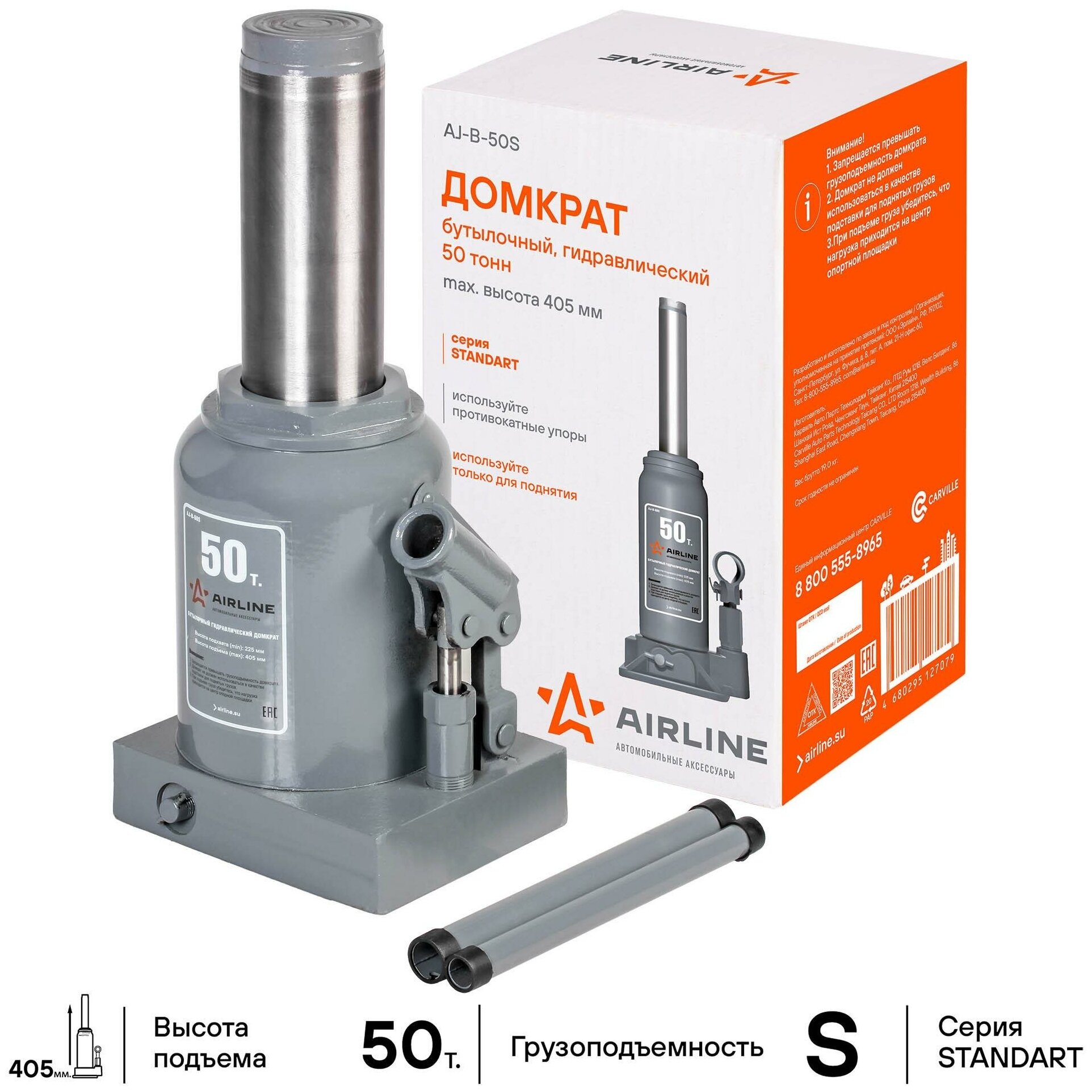 Домкрат бутылочный 50т S (MIN - 225 мм, MAX - 405 мм) (AJ-B-50S) AIRLINE AJ-B-50S | цена за 1 шт