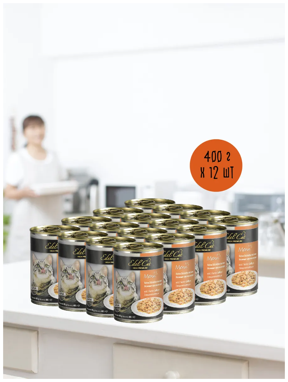 Влажный корм для кошек Edel Cat консервы нежные кусочки в соусе 3 вида мяса птицы 0,4кг (12 шт)