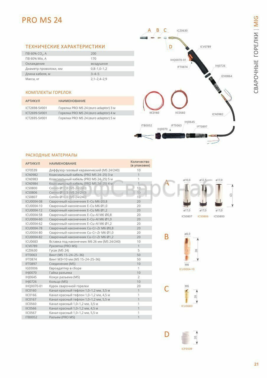 | Подробная комплектация | -сварочная горелка MS 24 – 1 шт.; -евро адаптер – 1 шт.; -коаксиальный кабель – 1 шт.; -рукоятка в сборе – 1 шт.; -гусак – 1 шт.; -сопло – 1 шт.; -сварочный наконечник – 1 шт.; -канал направляющий – 1 шт.; -диффузор - 1 шт.; -вставка под наконечник - 1 шт. |