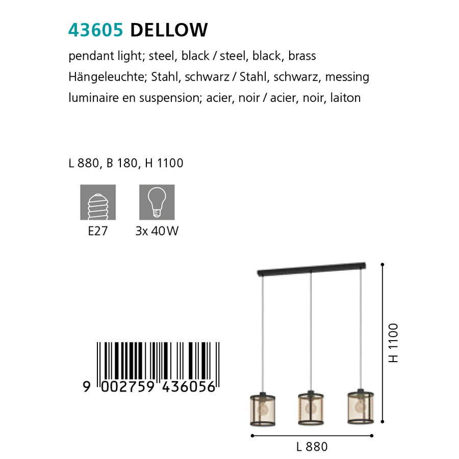 Светильник подвесной Eglo Dellow 43605, E27, 120Вт, кол-во ламп:3шт., Черный