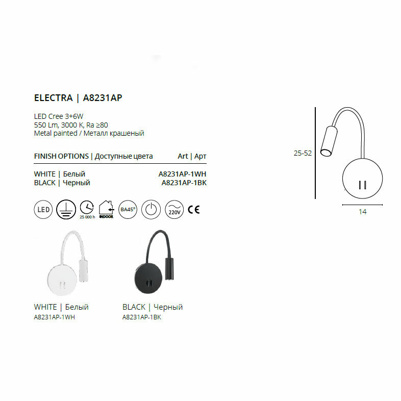 Настенное бра Arte Lamp Electra A8231AP-1BK, LED, кол-во ламп:1шт., Черный