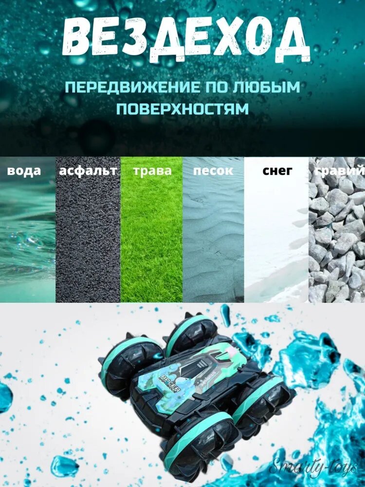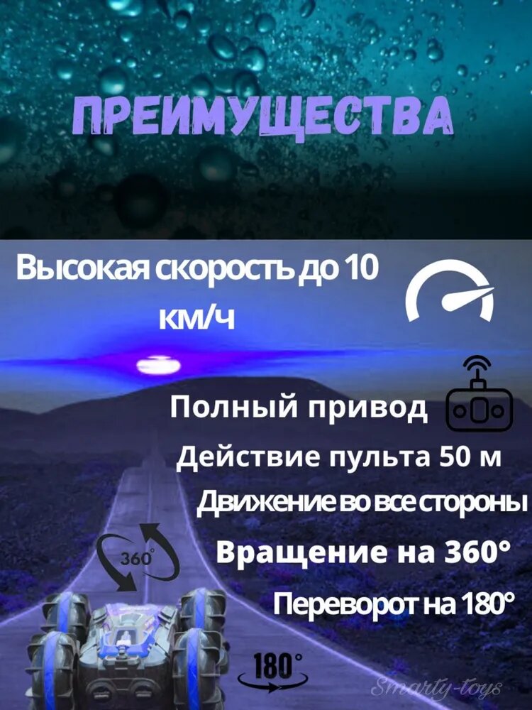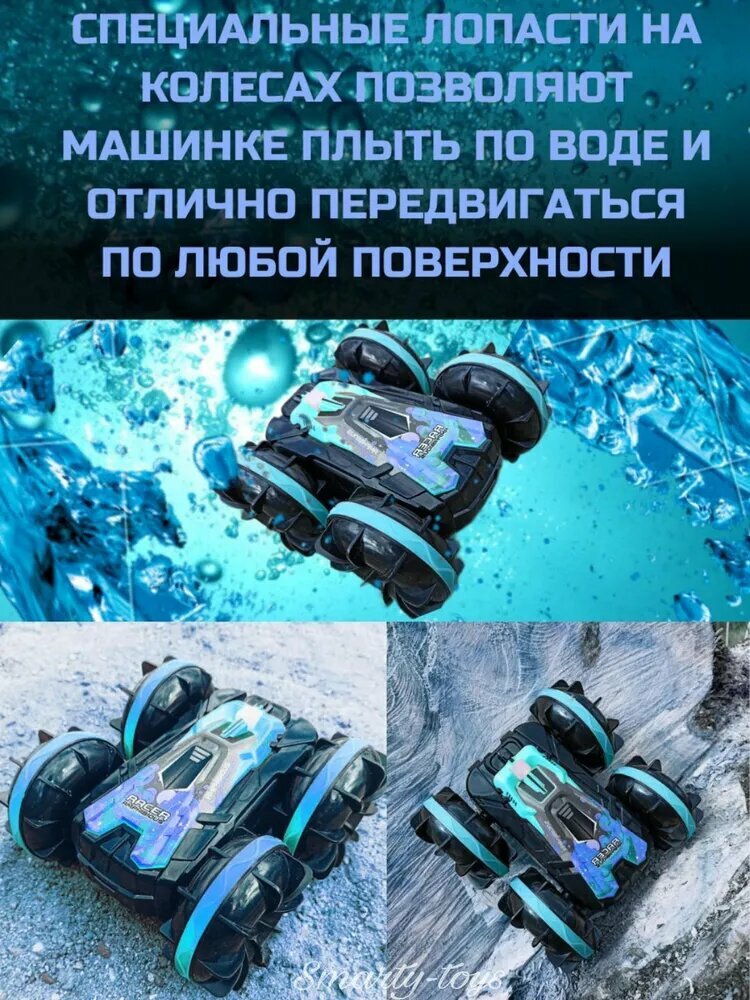 Машинка амфибия на радиоуправлении светящаяся, машина на пульте управления перевертыш с аккумулятором Car Amphibiou, полный привод, Синия-Цветная
