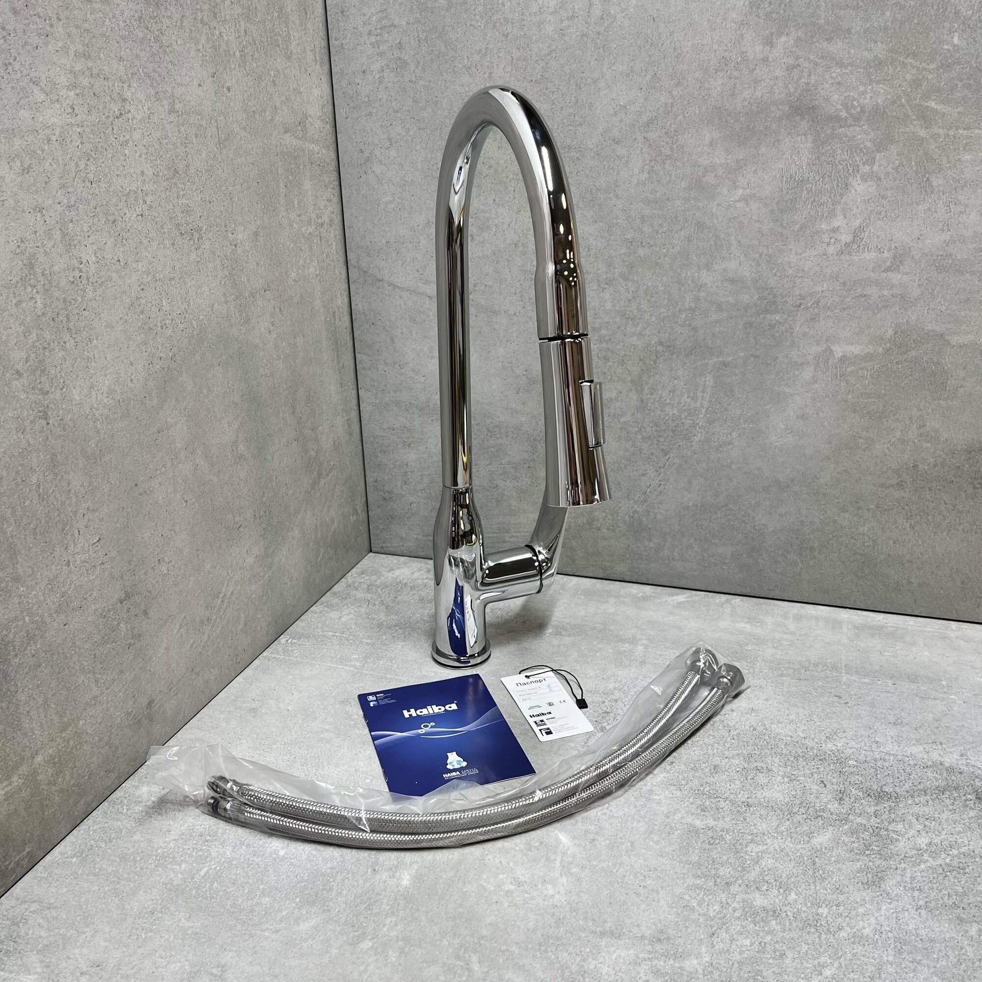 Смеситель для кухни Haiba HB73816 с высоким, поворотным, выдвижной лейкой, материал: латунь, цвет: хром