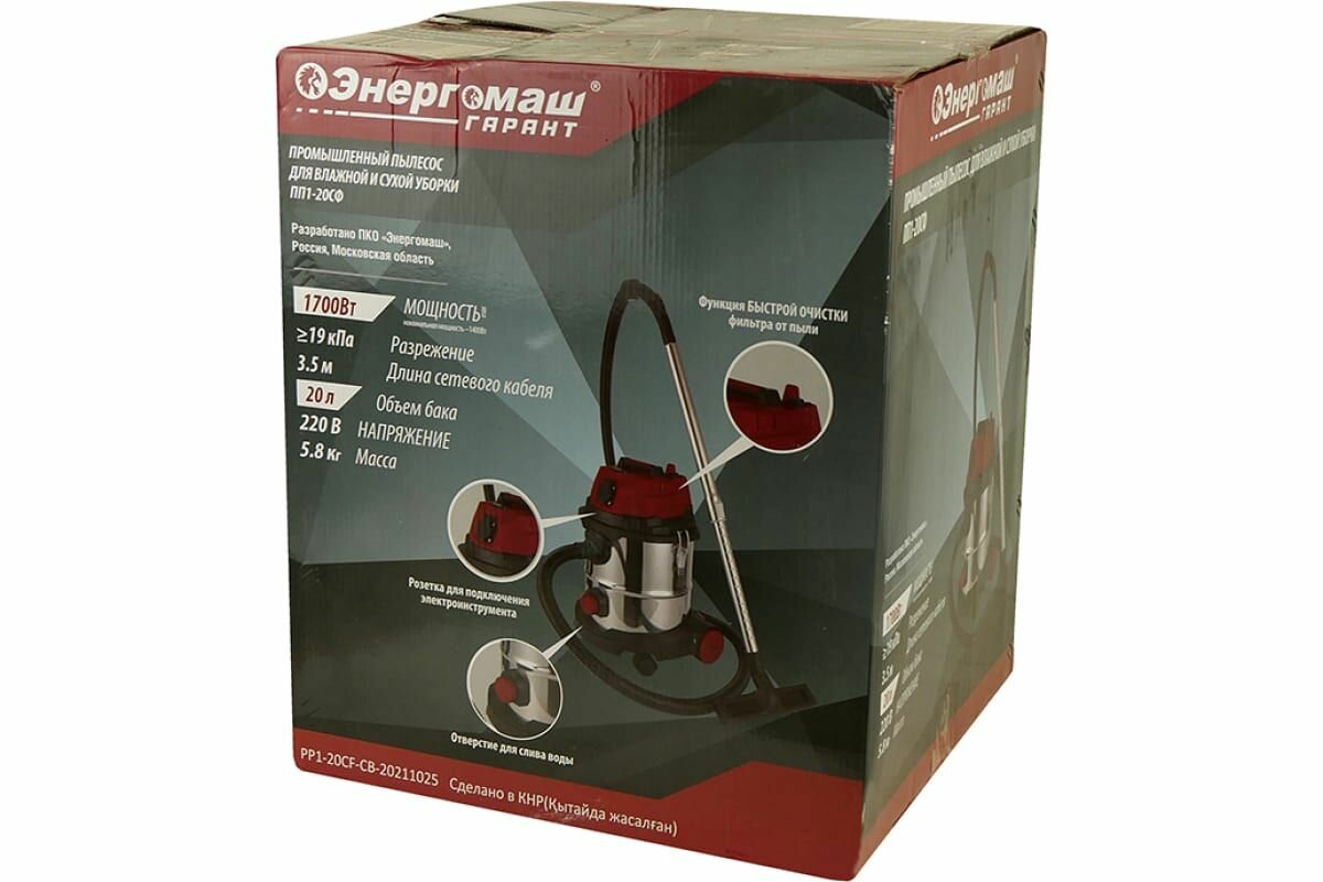 Профессиональный пылесос Энергомаш Гарант ПП1-20СФ, 1700 Вт, серебристый/красный/черный
