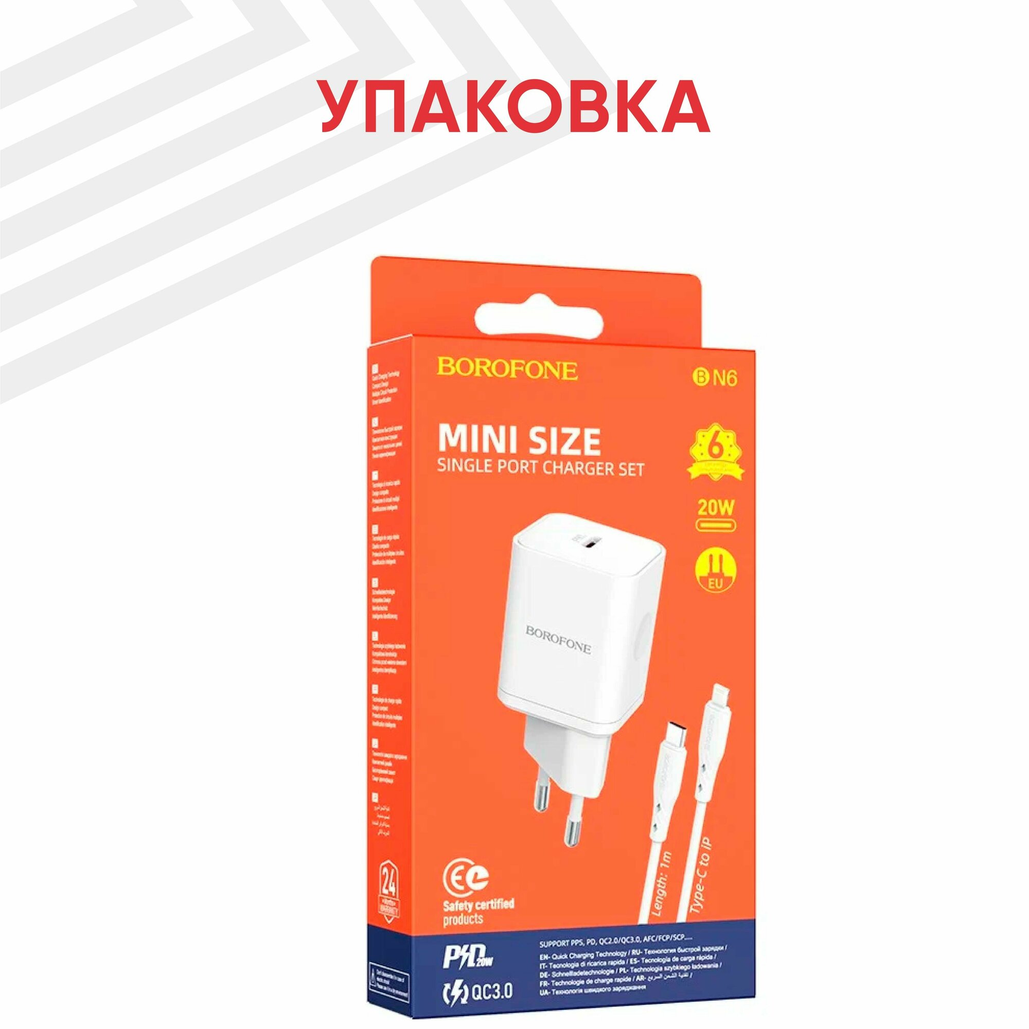 Сетевое зарядное устройство (СЗУ) Borofone BN6 (Type-C) + кабель Type-C-Lightning, 3 А, белый