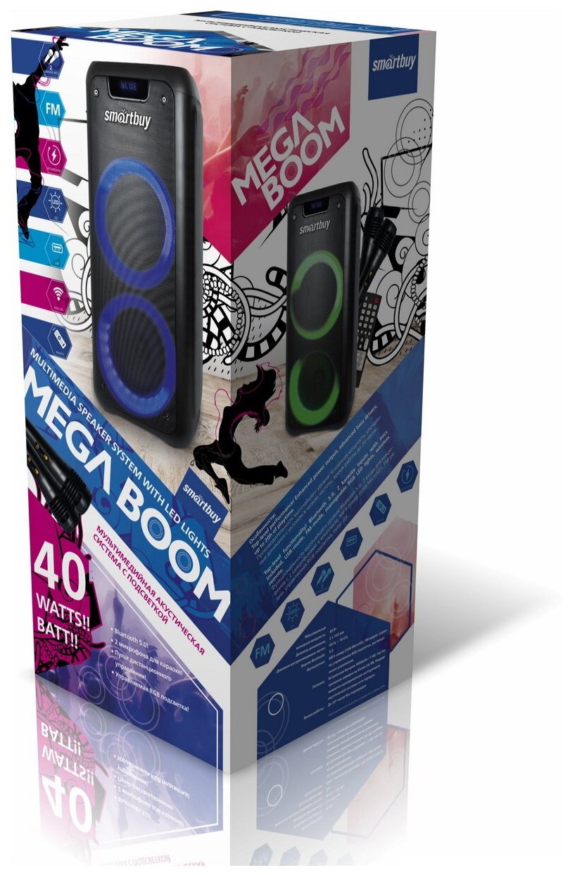 Портативная колонка SmartBuy MEGA BOOM, 40 Вт, Bluetooth, MP3, FM, 2 микрофона, ПДУ, LED-свет