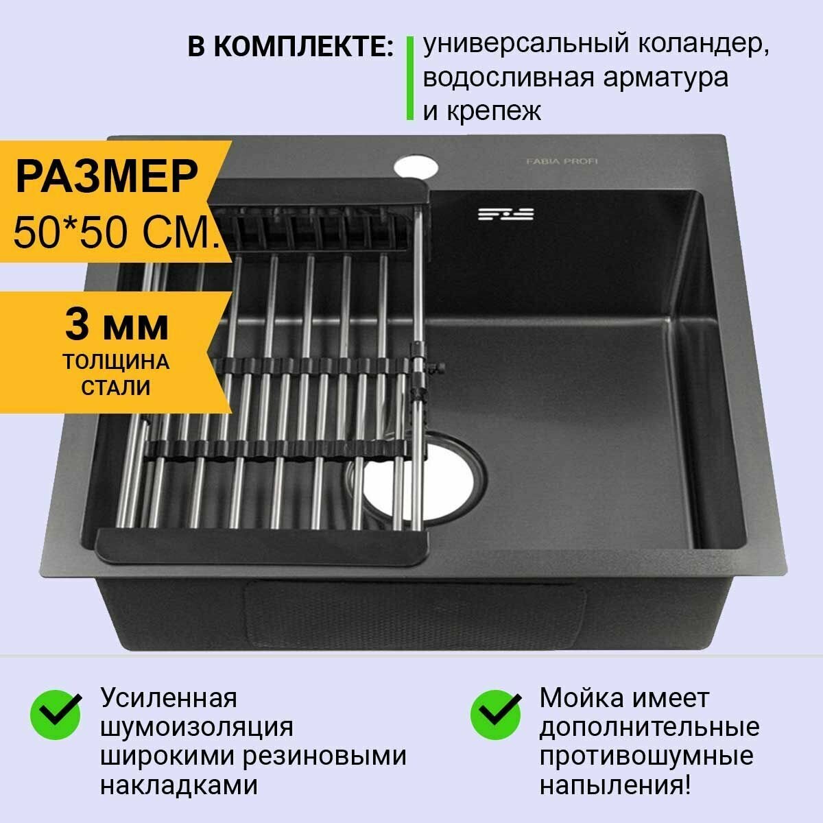 Купить Мойка нержавеющая врезная 50х50 графит FABIA Profi (3.0х200) выпуск 3 1/2 с сифоном, с коландером