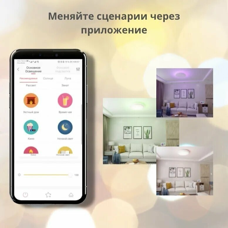 Освещает комнату 20 квадратов сполна , переживали что не хватит света. В приложении можно выбрать любой сценарий подсветки. |