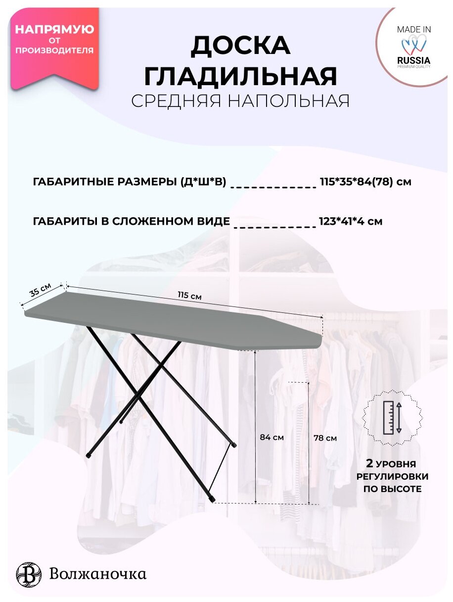Волжаночка Гладильная доска напольная с подставкой под утюг, 35х115 см, цвет серый интересное: