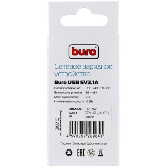 Сетевое зарядное устройство BURO TJ-159w, USB, 2.1A, белый