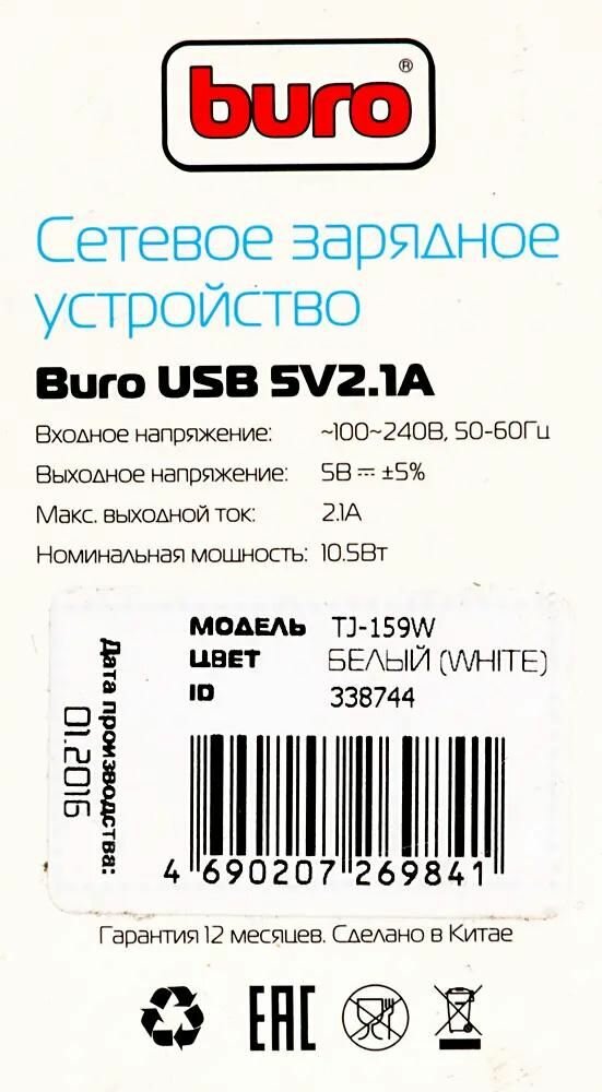 Сетевое зарядное устройство Buro TJ-159w 2.1A универсальное белый интересное: