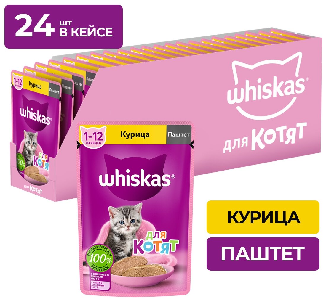 Влажный корм Whiskas для котят от 1 до 12 месяцев, паштет с курицей, 24 шт по 75 г