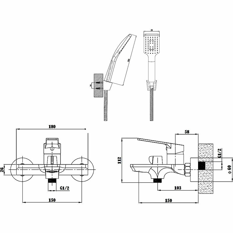 | Комплектация | эксцентрики / отражатели / шланг душевой (в мет. оплетке - 150см.) / лейка душевая(1 режим) / настенный держатель для лейки |