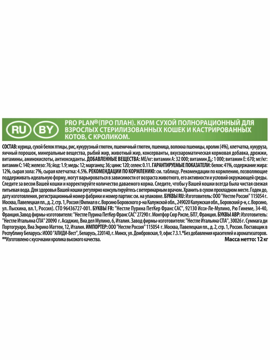 Сухой корм для стерилизованных кошек и кастрированных котов Purina Pro Plan Sterilised ADULT OPTIRENAL, с кроликом, 12 кг