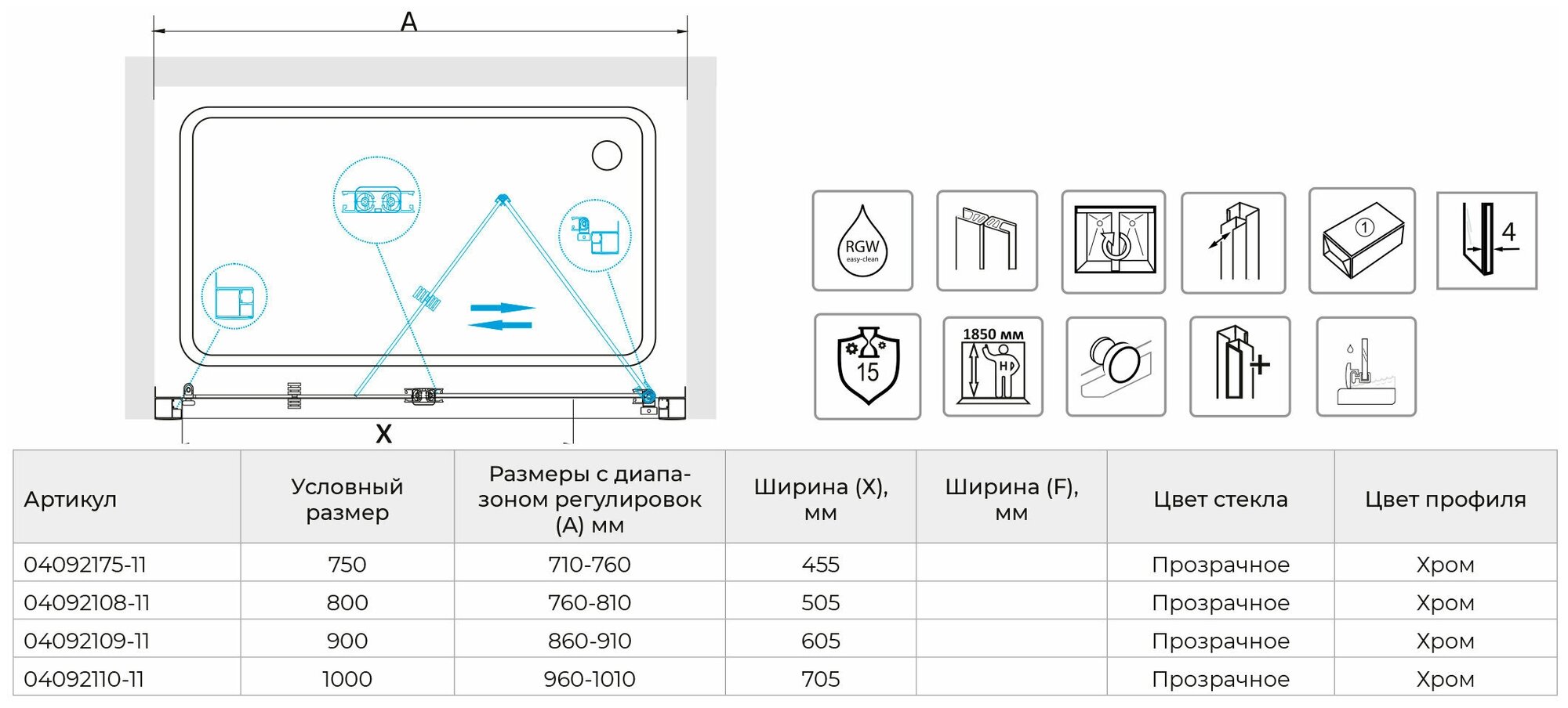 | Дополнительная информация | Комплектация | Душевая дверь - 1 шт. ,Инструкция - 1 шт.;Ширина. мм | 900;Толщина полотна двери, мм | 4;Материал полотна двери | стекло;Материал профиля | алюминий;Монтаж | на поддон/напольный;Поверхность | глянцевая;Дополнительная информация | регулируемый профиль 86-91 см; |