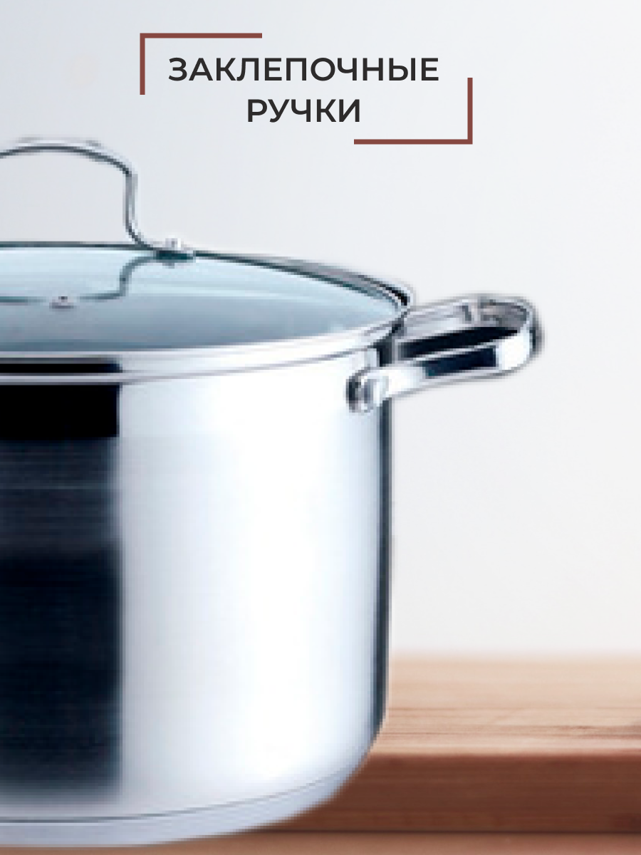 | Дополнительная информация | материал крышек: стекло; материал ручек: сталь; многослойное дно; пятислойное дно; клепаные ручки; диаметр кастрюль: 16 см, 18 см, 20 см, 22 см, 24 см, 26 см |