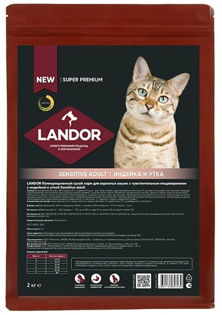 LANDOR полнорационный сухой корм для взрослых кошек с чувствительным пищеварением c индейкой и уткой, 2кг