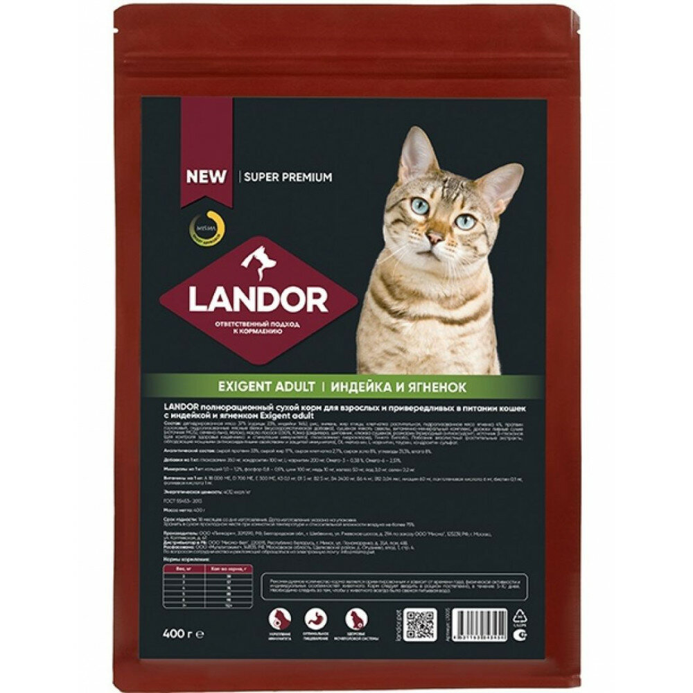 LANDOR полнорационный сухой корм для взрослых и привередливых в питании кошек, индейка с ягненком, 400 г